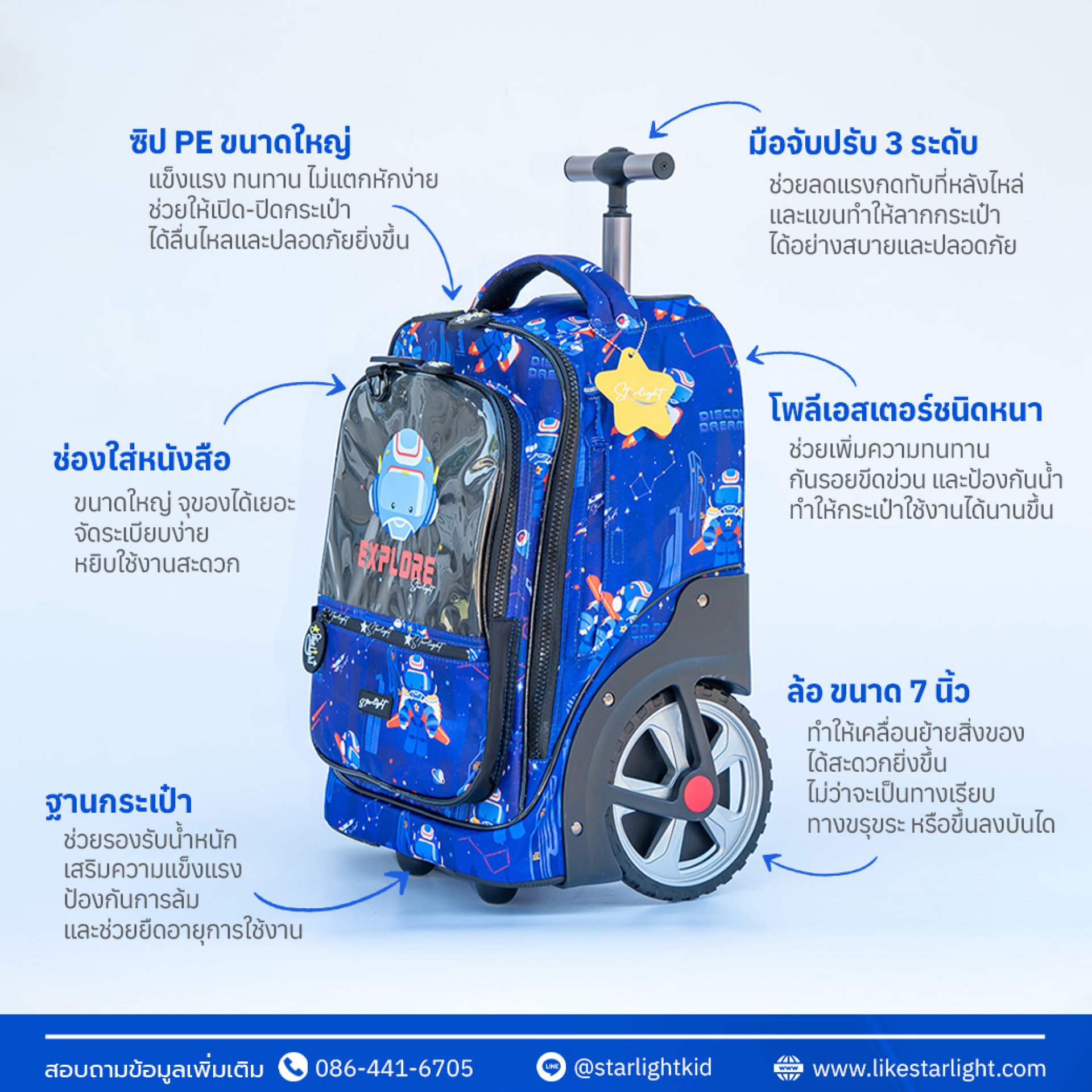 ล้อแข็งแรงและลื่นไหล ล้อของกระเป๋าควรมีความแข็งแรง ทนทาน และสามารถหมุนได้อย่างลื่นไหลเพื่อลดแรงเสียดทานขณะลาก ช่วยให้เด็กไม่ต้องออกแรงมากจนเกินไป
