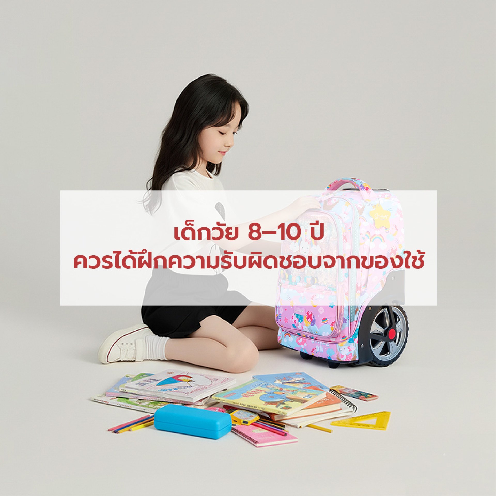 เด็กวัย 8-10 ปีคือช่วงเวลาทองที่ควรปลูกฝังความรับผิดชอบผ่านของใช้ส่วนตัว การจัดการสิ่งเล็ก ๆ ในชีวิตประจำวัน เช่น การดูแลกระเป๋า เสื้อผ้า หรืออุปกรณ์เรียน จะช่วยสร้างวินัย ความมั่นใจ และความภาคภูมิใจในตัวเอง พ่อแม่ที่ให้โอกาสลูกได้ลองผิดลองถูกและเรียนรู้จากประสบการณ์ จะช่วยหล่อหลอมให้ลูกเติบโตเป็นผู้ใหญ่ที่รับผิดชอบและประสบความสำเร็จในอนาคต