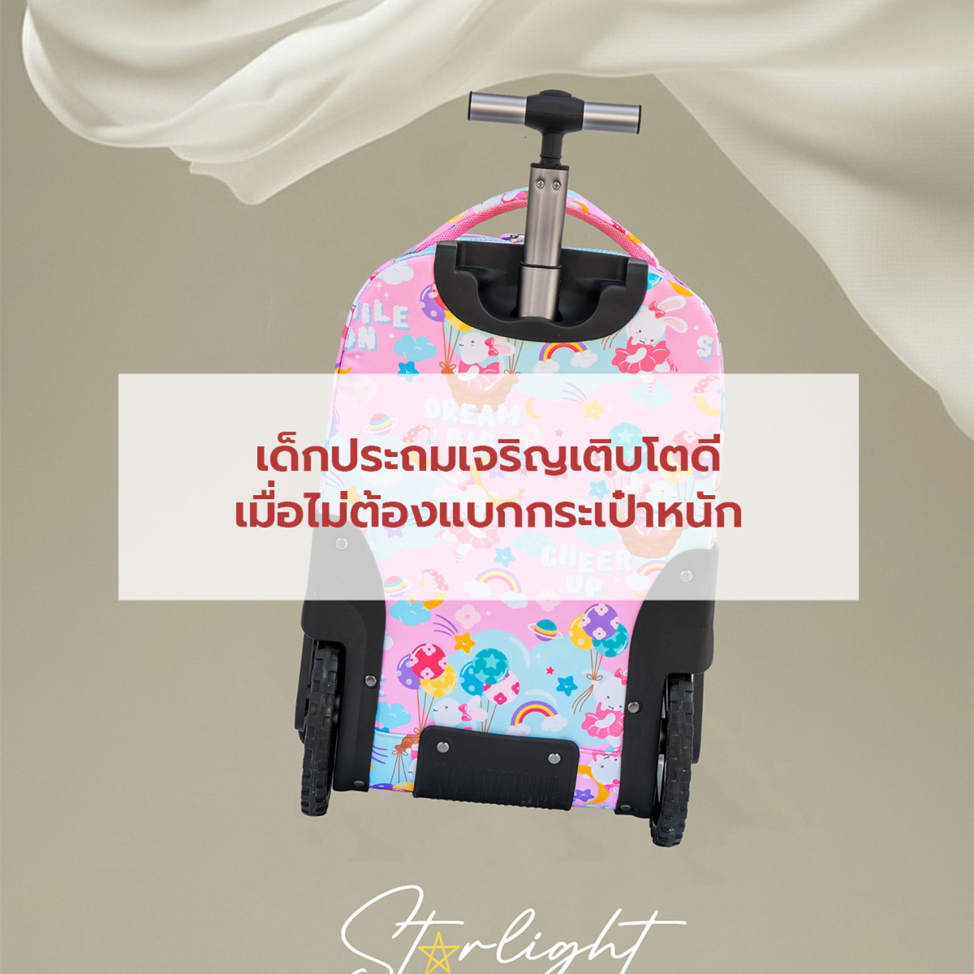 การเจริญเติบโตที่ดีเริ่มจากการลดภาระ พ่อแม่สามารถช่วยให้ลูกเจริญเติบโตอย่างเหมาะสมได้ด้วยการ ลดน้ำหนักที่ลูกต้องแบก เช่น การใช้กระเป๋าล้อลากแทนกระเป๋าสะพาย เพราะกระเป๋าล้อลากจะช่วยถ่ายน้ำหนักลงพื้น เด็กไม่ต้องรับแรงกดบนหลังและไหล่โดยตรง อีกทั้งยังลดแรงกระแทกที่อาจส่งผลต่อข้อต่อ การเปลี่ยนเพียงสิ่งเล็ก ๆ อย่างกระเป๋าเรียน จึงสามารถป้องกันปัญหาสุขภาพได้ในระยะยาว เมื่อเด็กไม่ต้องแบกของหนัก ร่างกายก็สามารถเจริญเติบโตได้อย่างสมดุล กล้ามเนื้อและกระดูกได้รับการพัฒนาอย่างถูกต้อง เด็กจะมีท่าทางการเดินที่ดีขึ้น ดูมั่นใจขึ้น และมีพลังสำหรับการเรียนรู้ตลอดวัน