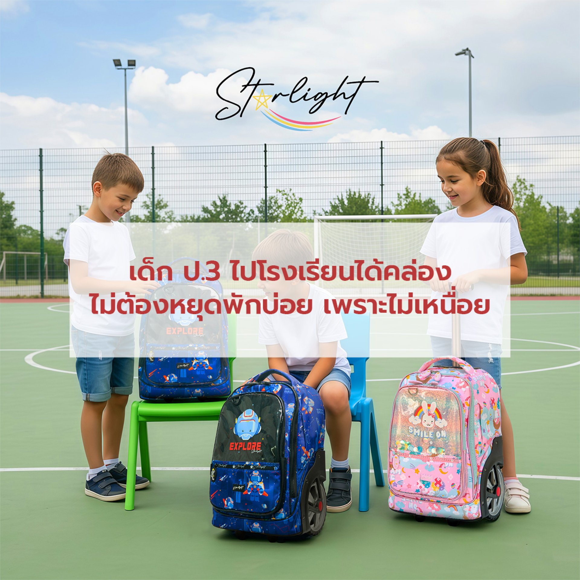 กระเป๋าล้อลาก Starlight: ผู้ช่วยที่เข้าใจเด็กจริง ๆ กระเป๋าล้อลากของแบรนด์ Starlight ออกแบบมาเพื่อเด็กวัยประถมโดยเฉพาะ ด้วยโครงสร้างแข็งแรง น้ำหนักเบา และล้อขนาดใหญ่ที่ลากได้อย่างนุ่มนวล ไม่สะเทือน เด็กสามารถลากได้เองโดยไม่ต้องใช้แรงมาก ดีไซน์ของ Starlight ยังเน้นความน่ารักสดใส เหมาะกับบุคลิกของเด็กวัย ป.3 ที่กำลังเต็มไปด้วยจินตนาการและพลังบวก ด้วยคุณสมบัติที่ช่วยกระจายน้ำหนักได้ดีและโครงสร้างที่ป้องกันแรงกระแทก ทำให้เด็กสามารถเดินทางไปกลับโรงเรียนได้อย่างสบาย ไม่ต้องหยุดพักบ่อย และยังช่วยถนอมกระดูกหลังและหัวไหล่ในระยะยาว