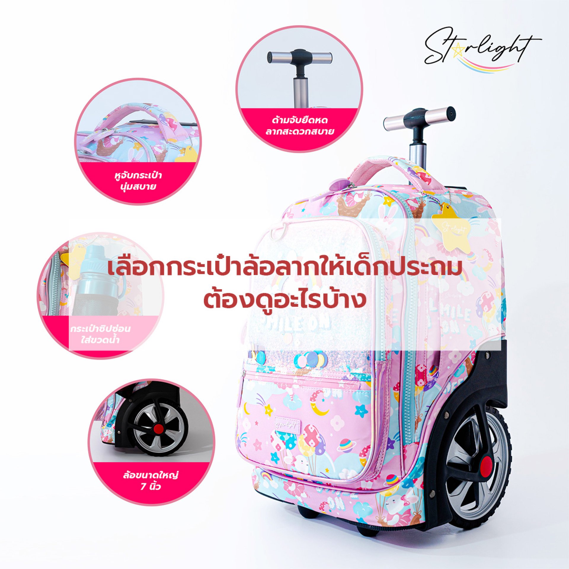 แนะนำแนวทางเลือกกระเป๋าล้อลากคุณภาพ สำหรับพ่อแม่ที่มองหากระเป๋าคุณภาพดี แนะนำให้เลือกแบรนด์ที่ออกแบบโดยคำนึงถึงสรีระเด็กโดยเฉพาะ เช่น Starlight ซึ่งมีทั้งรุ่น The Dreammer และ The Explorer ที่โดดเด่นด้วยฐานแข็งแรง ล้อใหญ่ลากง่าย และวัสดุกันน้ำ ตัวกระเป๋ามีน้ำหนักเบาเหมาะกับเด็กประถมทุกช่วงวัย อีกทั้งยังมีดีไซน์สดใส ถูกใจเด็ก ๆ และผ่านการทดสอบด้านความปลอดภัยอย่างเข้มงวด การเลือกกระเป๋าที่ดีไม่ใช่เพียงเรื่องของความสวยงาม แต่คือการลงทุนเพื่อสุขภาพหลังและข้อต่อของลูก การมีกระเป๋าที่ช่วยแบ่งเบาภาระจะทำให้เด็กเดินทางไปโรงเรียนอย่างมั่นใจและมีความสุขทุกวัน