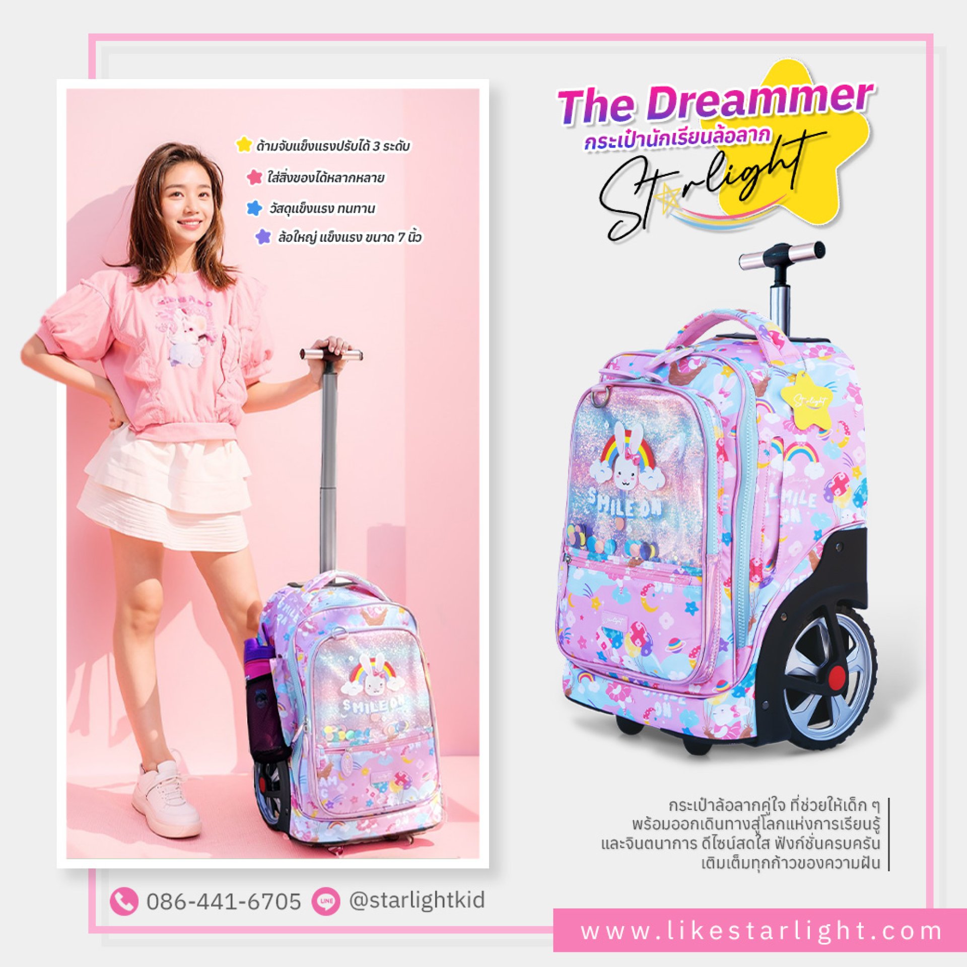Starlight เป็นแบรนด์กระเป๋านักเรียนล้อลากที่ออกแบบมาเพื่อรองรับการใช้งานของนักเรียนทุกเพศทุกวัย ด้วยการผสมผสานดีไซน์ที่ทันสมัย วัสดุคุณภาพสูง และฟังก์ชันที่ตอบโจทย์การใช้งานประจำวัน กระเป๋านี้ไม่เพียงช่วยลดภาระน้ำหนัก แต่ยังเพิ่มความสะดวกสบายและลดปัญหาด้านสุขภาพได้อย่างมีประสิทธิภาพ